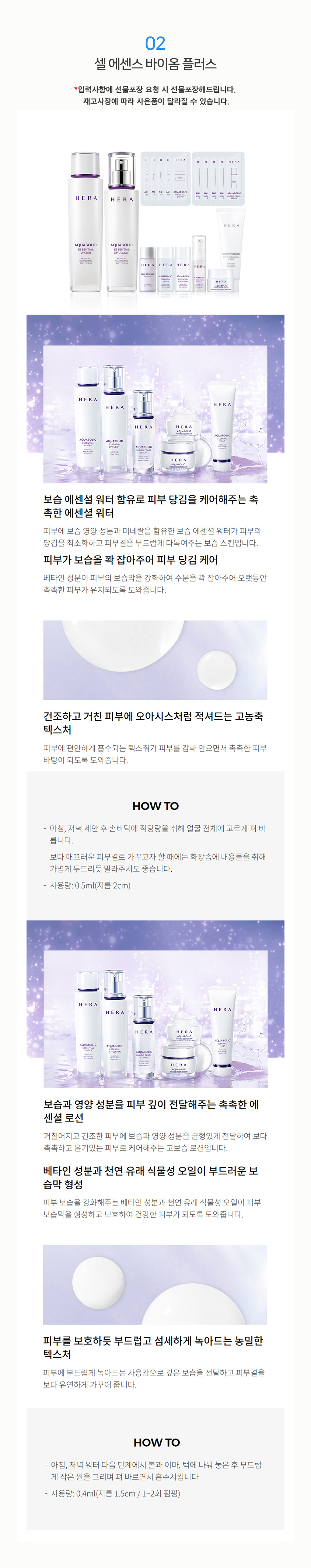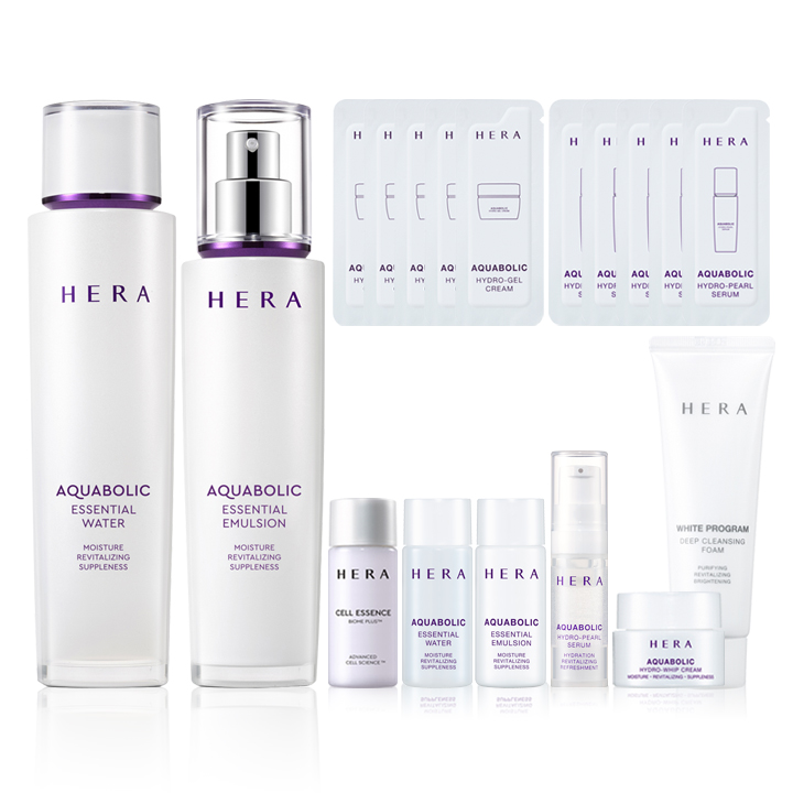 구성: 셀에센스 바이옴 플러스 15ml + 아쿠아볼릭에센셜 워터, 에멀전 각 15ml + 하이드로펄세럼 5ml + 휩크림 5ml + 클렌징폼 50ml + 펄세럼 1ml x5 + 젤크림 1ml x5
